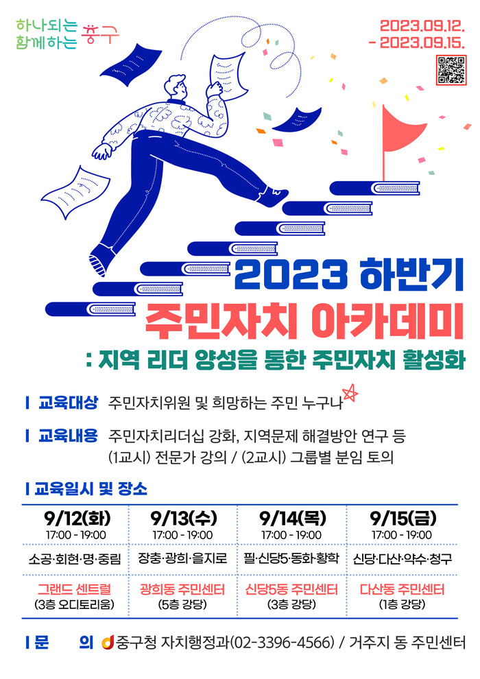 이번 아카데미는 권역별로 3~4개 동씩 나눠 ▲9월12일 회현동 그랜드 센트럴 ▲9월13일 광희동 주민센터 ▲9월14일 신당5동 주민센터 ▲9월15일 다산동 주민센터에서 찾아가는 교육으로 진행된다.