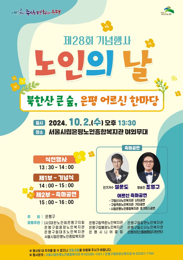 [시민일보 = 이대우 기자]서울 은평구(구청장 김미경)가 오는 2일 시립은평노인종합복지관에서 ‘제28회 노인의 날 기념행사’를 개최한다.