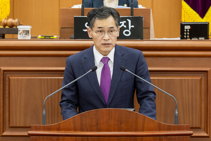 | ▲ 제311회 양천구의회 임시회에서 시정연설을 통해 시책을 설명중인 이 구청장의 모습. (사진=양천구청 제공) |