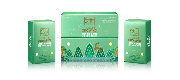 ‘천녹 그로잉’은 뉴질랜드 최상위 SAT 등급 녹용에 정관장 6년근 홍삼, 한삼덩굴추출물, 식물혼합농축액(황기,당귀,진피,감초,백출) 등 성장기 어린이 특화원료를 맞춤형 설계로 배합한 정관장 최초의 키즈 녹용 제품이다.