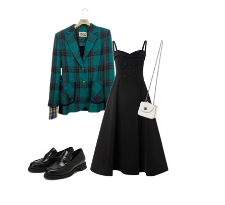 그린 컬러는 겨울철에 생기를 불어넣는 키 컬러중 하나이다. 클래식하면서도 트렌디한 분위기를 동시에 자아내고싶다면, 그린 컬러의 체크 패턴 자켓을 추천한다. 체크 패턴은 그 자체로 눈에 띄는 아이템이기에, 원피스는 심플한 디자인을 선택하는 것이 좋다. 미디 기장의 블랙 베이직 컬러 원피스를 함께 매치하면 자켓의 포인트를 살려줌과 동시에 페미닌한 분위기를 한층 더 돋보이게 한다. 여기에 미니멀한 로퍼를 더해 세련된 겨울 스타일을 완성해보자.