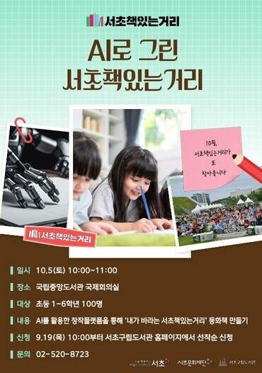 [시민일보 = 박소진 기자] 서울 서초구(구청장 전성수)가 오는 10월5일 국립중앙도서관 국제회의장에서 ‘AI로 그린 서초책있는거리’ 행사를 개최한다.