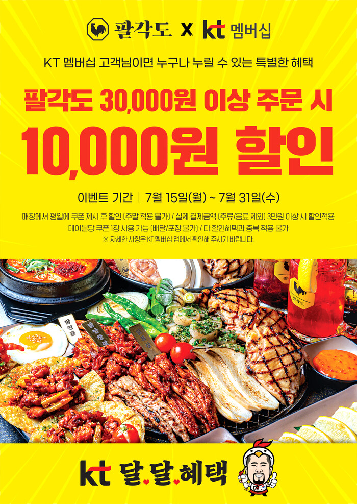 고기집 창업 프랜차이즈 팔각도와 KT가 함께 진행하는 7월 '달달혜택' 프로모션은 15일(월)부터 31일(수)까지 KT 멤버십 고객 대상으로 진행된다. 이번 프로모션은 테이블당 1회 할인되며, 타 할인 혜택과 중복 적용 불가하다. 3만원 이상(주류/음료 제외)결제시 1만원 할인 혜택이 적용된다.(주중 방문시만 가능)