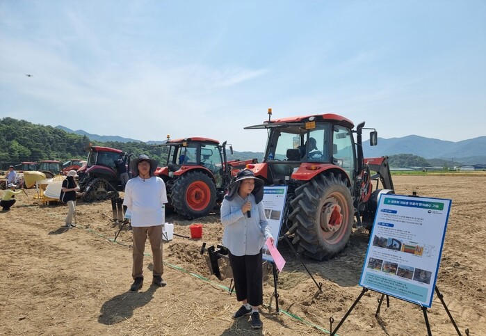 밀, 콩 재배농가 등 150여 명이 참석한 이번 연시회에서 밀 수확 후 밀짚 파쇄, 배수 개선, 콩 정밀파종 방제 등을 이용한 밀+콩 전과정의 기계 작업을 선보였다.