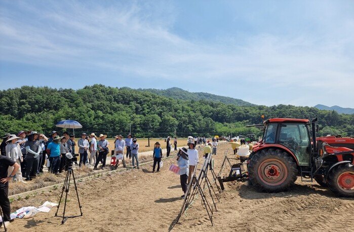 [구미=박병상 기자] 경북 구미시는 11일 옥성면 초곡리 일원에서 농업기술센터 주관으로 ‘밀+콩 이모작 기계화 연시회’를 개최했다.