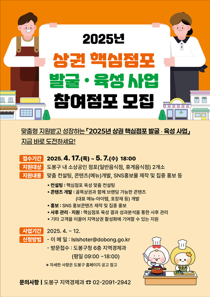 [시민일보 = 문민호 기자] 도봉구(구청장 오언석)는 ‘2025 상권 핵심점포 발굴·육성 사업’에 참가할 점포를 모집한다고 28일 밝혔다.