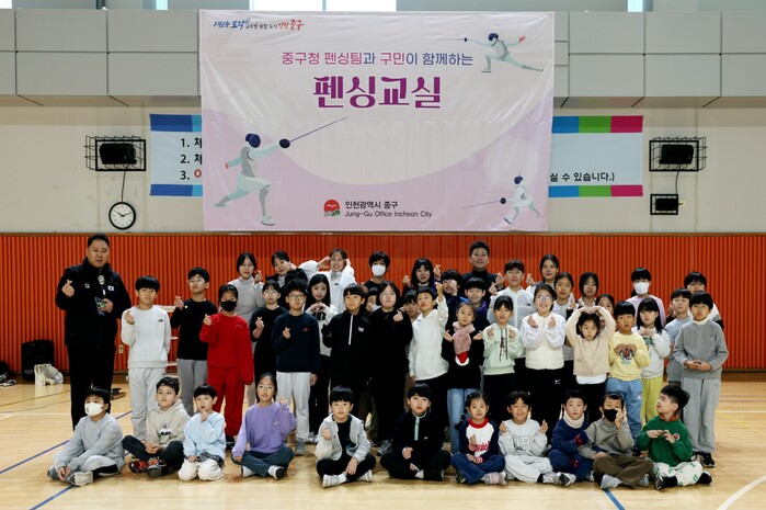 인천시 중구(구청장 김정헌)는 중구청 펜싱팀이 지난 7일 영종국제도시 소재 중구 하늘문화센터 체육관에서 관내 거주 초등학생 약 50여 명을 대상으로 ‘구민과 함께하는 펜싱 교실’을 성황리에 운영했다고 밝혔다.