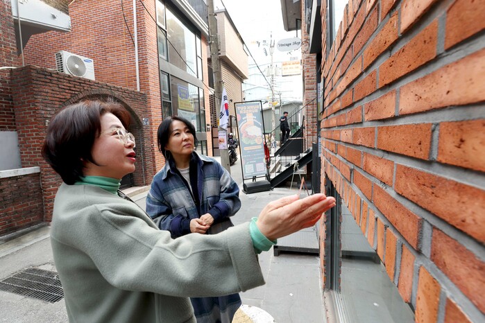 | ▲ 건축사무소 대표(좌)와 성수동 주민(우)이 붉은벽돌 건축물을 살펴보고 있다. (사진=성동구청 제공) |