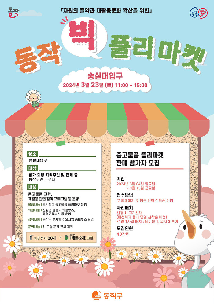 [시민일보 = 여영준 기자] 동작구(구청장 박일하)가 오는 23일 오전 11시 숭실대학교 정문에서 가정에서 사용하지 않거나 재사용 가능한 물품을 구민이 직접 사고팔 수 있는 ‘동작빅플리마켓’ 행사를 개최한다.