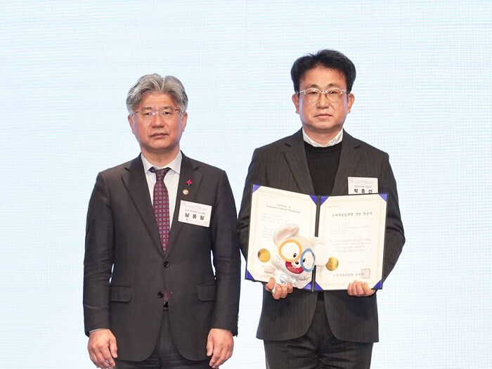 | ▲ 지난 12일, 서울 서초구 엘타워에서 열린 2025 소비자중심경영 인증서 수여식을 마치고 남동일 공정거래위원회 부위원장(왼쪽)과 박종선 현대이지웰 대표(오른쪽)이 기념사진을 촬영하고 있는 모습. (사진=현대이지웰 제공) |