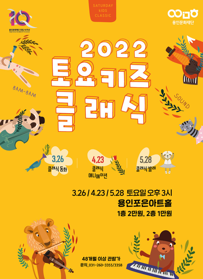 올해로 10주년을 맞이한 <토요키즈클래식>은 용인문화재단의 대표 어린이 상설 공연으로 지난 3월 티켓 오픈 당일 전석 매진을 기록하는 등 많은 사랑을 받고 있다. 2022 <토요키즈클래식>은 클래식을 기반으로 다양한 장르의 프로그램을 기획하였으며, 어린이 대상 공연인 만큼 교육적 요소를 부가하기 위해 상황극과 결합된 클래식 콘서트 컨셉으로 아이들이 클래식 음악을 더욱 쉽고 재밌게 접할 수 있게 구성하였다.