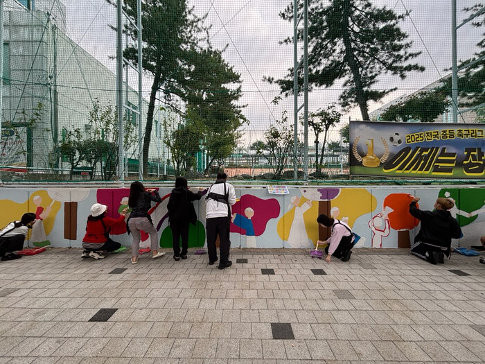 | ▲ 벽화 채색활동을 진행하고 있는 중화1동 주민자치회와 장안중 학생들. (사진=중랑구청 제공) |