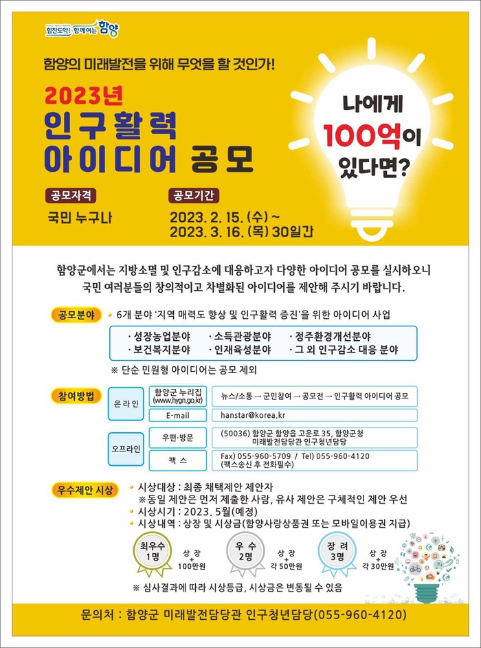 ‘나에게 100억이 있다면? (함양의 미래발전을 위해 무엇을 할 것인가!)’이란 주제의 이번 공모는 국민 누구나 참여가 가능하며 ▲성장농업분야 ▲소득관광분야 ▲정주환경개선분야 ▲보건복지분야 ▲인재육성분야 ▲그 외 인구감소 대응분야 등 6개 분야를 공모한다.