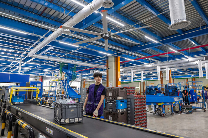 | ▲ 청주 서브허브 CLS 직원이 대형 파이프를 통해 나오는 에어컨 냉기 아래서 작업하고 있다. (사진=CLS 제공) |
