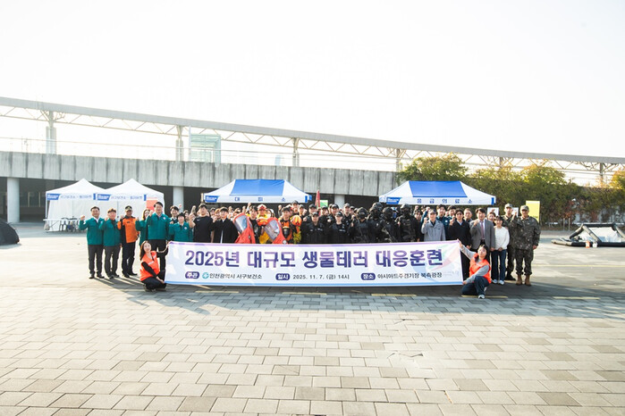 [인천=문찬식 기자] 인천 서구(청장 강범석)는 지난 7일 아시아드주경기장 북측광장에서 ‘2025년 생물테러 대비·대응 대규모 모의훈련’을 실시하고, 관계기관과의 협업 체계를 점검하며 신속한 현장 대응 역량 강화에 나섰다.