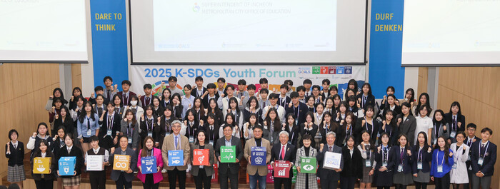 [인천=문찬식 기자] 인천광역시교육청(교육감 도성훈)은 16일 겐트대학교 글로벌캠퍼스에서 ‘포스트-SDGs 시대, 청소년이 여는 지속가능발전 글로벌 어젠다’를 주제로 ‘2025 K-SDGs 청소년 포럼’을 개최했다.