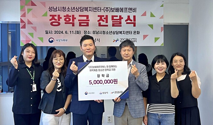 [성남=오왕석 기자] ㈜보배에프앤비는 성남시 위기 청소년 지원을 위해 성남시청소년재단 성남시청소년상담복지센터(소장 임낙선)에 장학금 500만원을 전달했다.