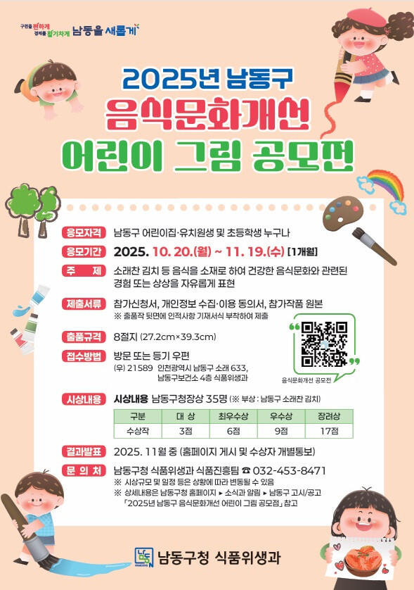 [인천=문찬식 기자] 인천 남동구는 지역 공동브랜드 ‘소래찬’출시 4주년을 기념해 남동구민의 일상 속 음식문화 개선과 어린이들의 올바른 식생활 습관 형성을 위한 ‘2025년 음식문화개선 어린이 그림 그리기 공모전’을 개최한다고 밝혔다.