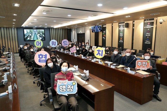서울 양천구는 지난 17일 2021 양천 협치 성과 공유의 장 ‘협치어워드’를 성료했다. 이날 행사에서는 2021년 협치 성과 발표와 더불어 협치의 다양한 분야에서 활약상을 보여준 지역 활동가들에 대한 시상도 함께 이뤄졌다. 사진은 이날 행사에서 김수영 구청장(앞쪽 왼쪽)이 지역 활동가들과 함께 협치 행정 팻말을 들고 기념촬영을 하는 모습. (사진제공=양천구청)