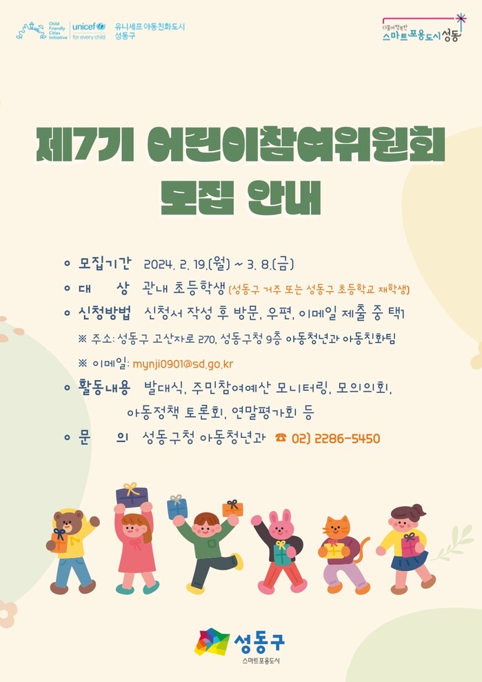 [시민일보 = 홍덕표 기자] 서울 성동구(구청장 정원오)가 아동이 ‘권리의 주체’로서 아동정책 전반에 참여하고 의견을 제시하는 제7기 성동구 어린이참여위원회 신규위원을 3월 8일까지 공개 모집한다.