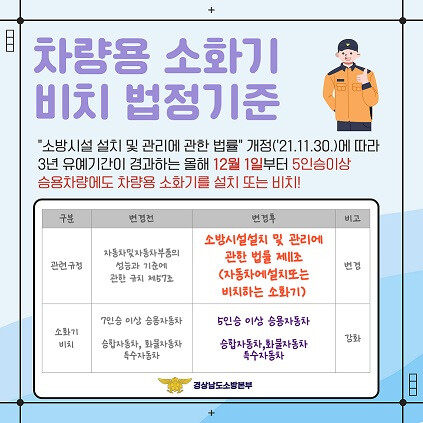 차량용 소화기는 현행 ‘소방시설 설치 및 관리에 관한 법률’에 의거 7인승 이상 차량에 의무 설치되도록 규정돼 있다. 하지만 동법 개정으로 12월 1일부터는 5인승 이상의 승용차를 포함한 모든 차량에 의무적으로 비치돼야 한다.