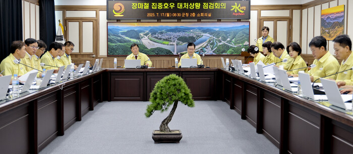 이날 회의는 부군수, 국·소장, 전 부서장이 참석해 자연재난 상황대응계획에 따른 15개 협업부서의 대처상황을 보고 하고 집중호우 대응체계를 점검했다.