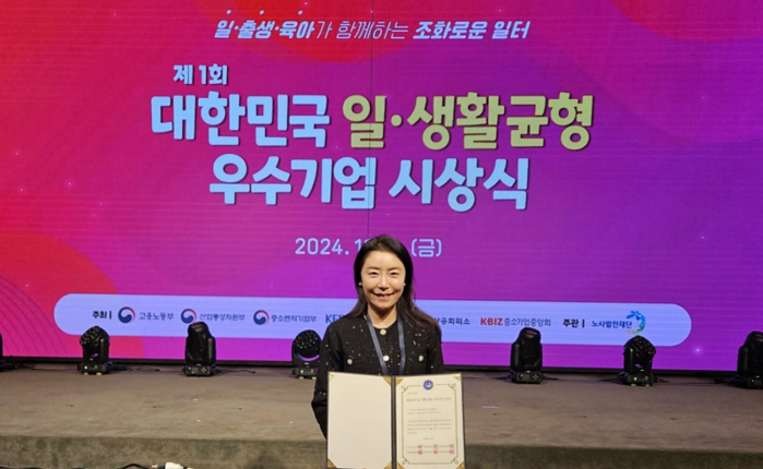대한민국 일·생활 균형 우수기업’은 고용노동부, 산업통상자원부, 중소벤처기업부 등이 공동 주최하고 노사발전재단이 주관하는 제도로 유연근무 활용, 근로시간 단축, 휴가 사용, 일과 육아의 병행, 일하는 방식과 문화 등을 정량·정성적 지표로 평가한다.