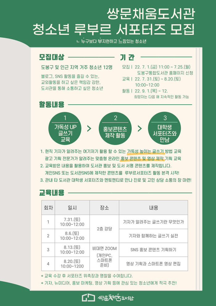 [시민일보 = 박준우 기자] 도봉구(구청장 이동진) 쌍문채움도서관은 오는 7월부터 중고생 청소년을 대상으로 '루부르 서포터즈 3기'를 모집한다.