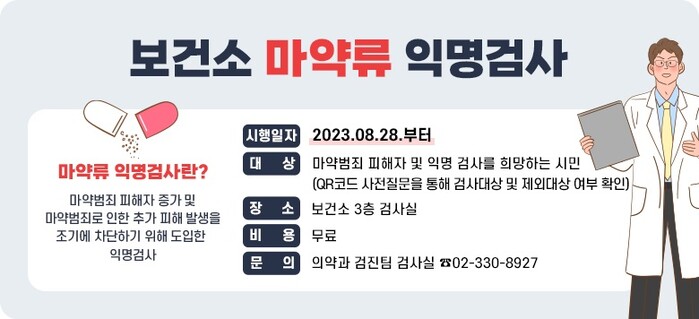 검사 장소는 서대문구 보건소 3층 검사실이며 비용은 무료다. 검사는 소변 채취 후 의료용 마약류 6종 검사 키트를 활용해 이뤄지며 소요 시간은 약 10~20분이다.