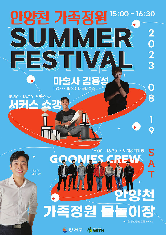 이번 ‘안양천 썸머 페스티벌’은 지난 7월 새롭게 선보인 안양천 가족정원 물놀이장을 무대로 ▲마술과 비눗방울(버블)을 결합한 ‘버블 매직쇼’ ▲인기 마술 유튜버 ‘쇼갱’과 함께하는 ‘도전 서커쇼’ ▲대한민국 최초 해군 출신 비보이팀 ‘더 구니스크루’의 비트박스·디제잉·브레이크댄스 등 관객도 공연의 주인공이 되는 소통형 공연을 선보인다.
