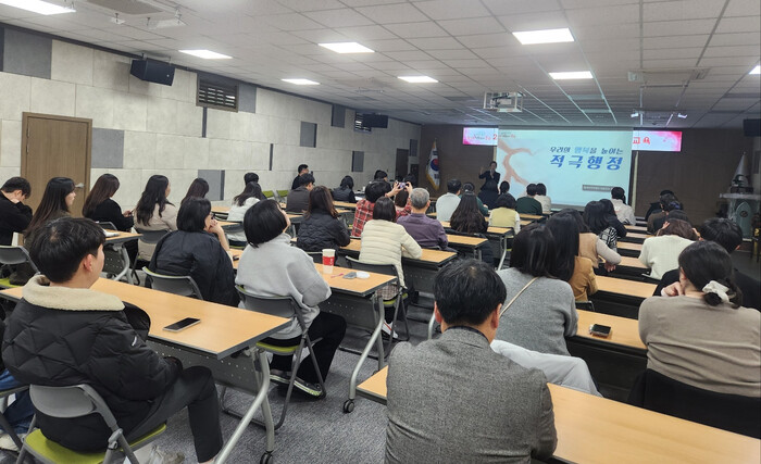이번 교육은 함께 성장컨설팅 대표인 이승은 강사를 초빙하여 ‘우리의 행복을 높이는 적극행정’이라는 주제로 진행되었다. 특히 이 강사는 공직자들이 적극행정 추진 과정에서 도움받을 수 있는 다양한 제도를 소개하고 적극행정을 통해 만족을 얻는 이는 주민뿐만이 아닌 공직자이기도 하다는 내용으로 참석자들의 흥미와 관심을 높였다.