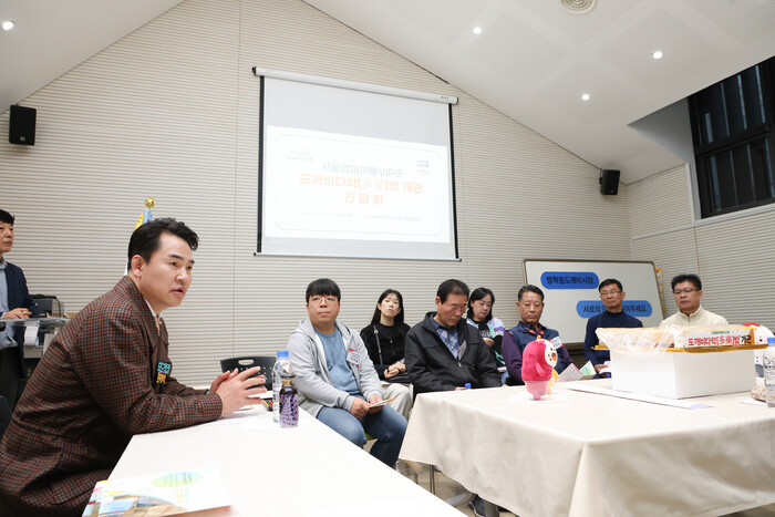 | ▲ 오언석 구청장(왼쪽)이 지난 3일 도깨비다락방 개관 간담회에서 도깨비시장상인회, 어린이집 원장 및 학부모들과 도깨비다락방 운영에 대한 의견을 교환하고 있다. (사진=도봉구청 제공) |