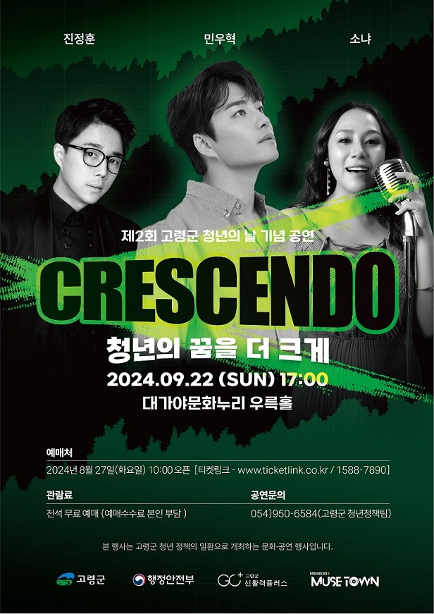 예매는 8월 27일 (화) 10시에 티켓링크에서 진행하며, 상세한 공연 문의는 고령군청 인구정책과 청년정책팀(☎054-950-6584)으로 연락하면 된다.