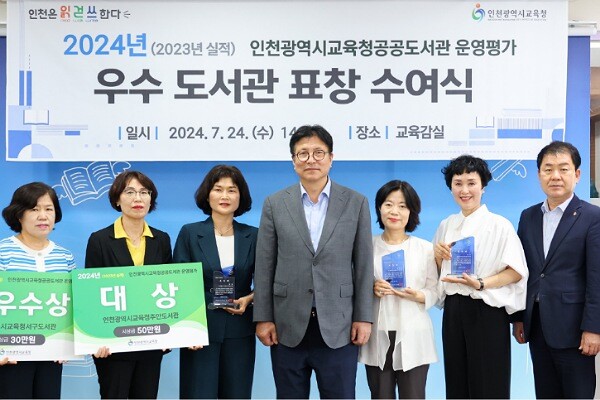 [인천=김형만 기자] 도성훈 교육감이 7월 24일 인천시교육청 소속 8개 공공도서관 중 우수 기관으로 선정된 주안도서관(관장 곽미혜), 서구도서관(관장 박정희), 계양도서관(관장 신순덕) 등 3개 도서관에 표창을 수여하고 격려했다.