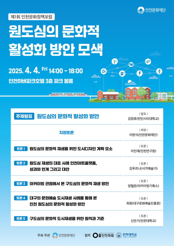 [인천=문찬식 기자] 인천문화재단은 오는 4월 4일(금) 오후 2시, 인천하버파크호텔 3층 파크볼룸에서 ‘2025년 제1회 인천문화정책포럼’을 개최한다.