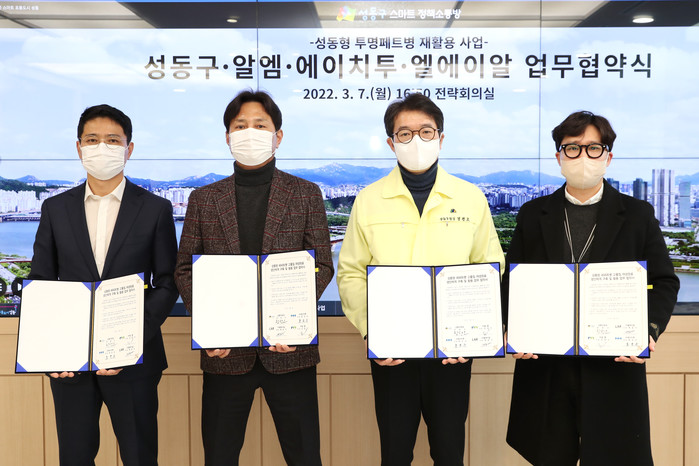 구는 최근 (주)알엠, (주)에이치투, (주)엘에이알 등 3개 민간기업과 '성동형 폐페트병 고품질 재생원료 생산체계 구축 및 활용'을 위한 업무 협약을 체결했다고 22일 밝혔다.