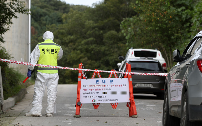 19일 오전 강원 춘천시의 한 양돈농가에서 아프리카돼지열병(ASF)이 발생해 방역 당국 관계자가 입구를 통제하고 있다.