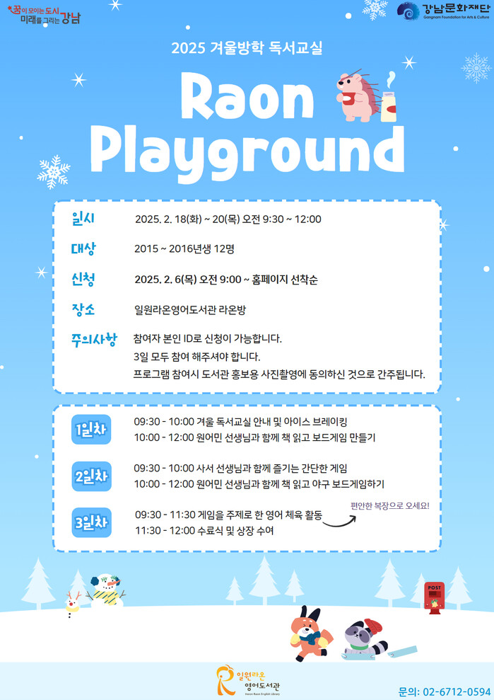 [시민일보 = 이대우 기자] (재)강남문화재단(이사장 이자연)에서 운영하는 일원라온영어도서관은 겨울방학을 맞아 2월 18일부터 20일까지 2015~16년생을 대상으로 겨울 독서교실을 운영한다.