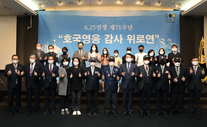 서울 강남구는 대한민국 6·25참전유공자회 강남구지의회 주관으로 25일 강남구 삼정호텔에서 6.25 참전 호국영웅 100여명이 참석한 가운데 감사 위로연을 개최했다. 사진은 이날 참석한 관계자들이 기념촬영을 하는 모습. (사진제공=강남구청)