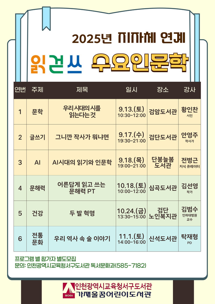 [인천=문찬식 기자] 인천광역시교육청서구도서관(관장 정연순)은 9월 13일부터 11월 1일까지 서구 관내 지자체 산하기관과 협력해 ‘찾아가는 읽걷쓰 인문학 강연’을 운영한다.