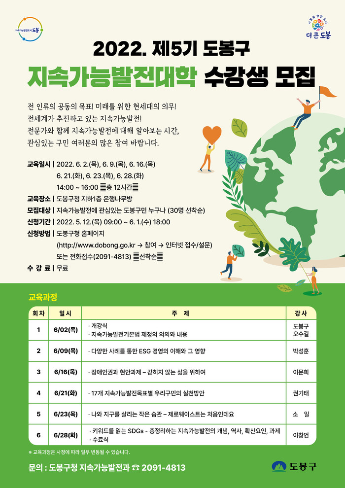 [시민일보 = 박준우 기자] 도봉구가 구민을 대상으로 오는 6월 '제5기 도봉구 지속가능발전대학' 수강생을 모집한다.
