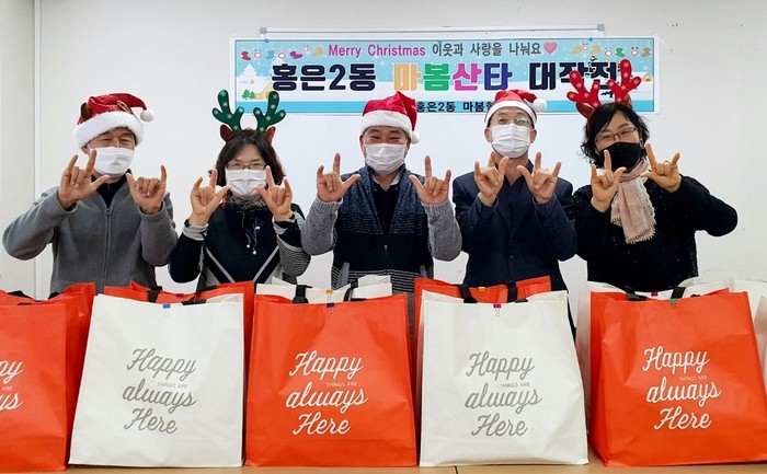 서울 서대문구 홍은2동 마봄협의체는 최근 크리스마스를 앞두고 저소득 노인 40가구에 삼계탕·전복죽 등으로 구성된 간편식 음식 꾸러미를 선물하는 ‘마봄산타 대작전’ 사업을 펼쳤다. 사진은 이날 협의체 위원들이 기념촬영을 하는 모습. (사진제공=서대문구청)