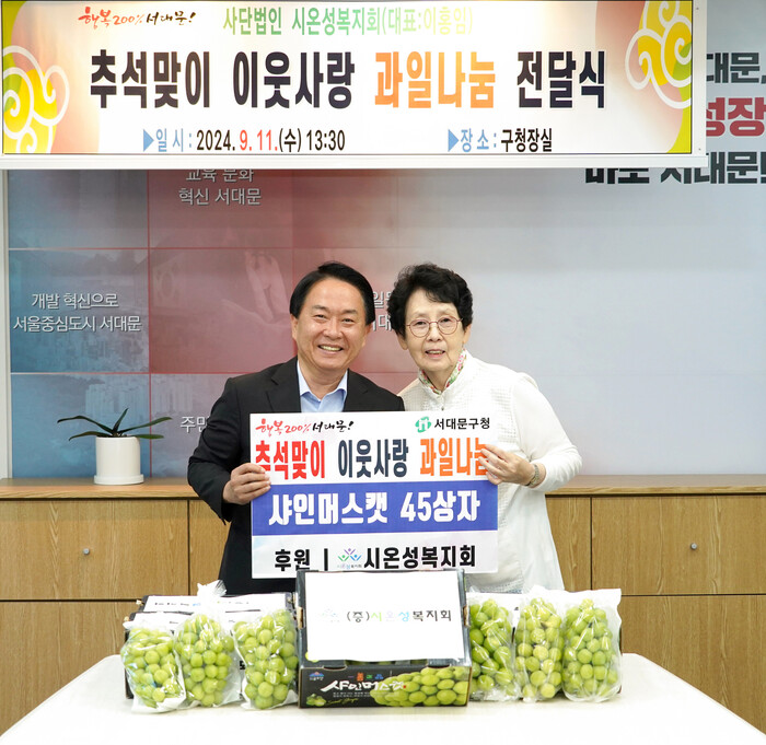 [시민일보 = 이대우 기자] 서대문구(구청장 이성헌)는 최근 사단법인 시온성복지회가 명절을 맞은 지역내 장애인복지시설(거주시설 및 주간이용시설) 10곳에 샤인머스캣 45상자를 기부했다고 2일 밝혔다.