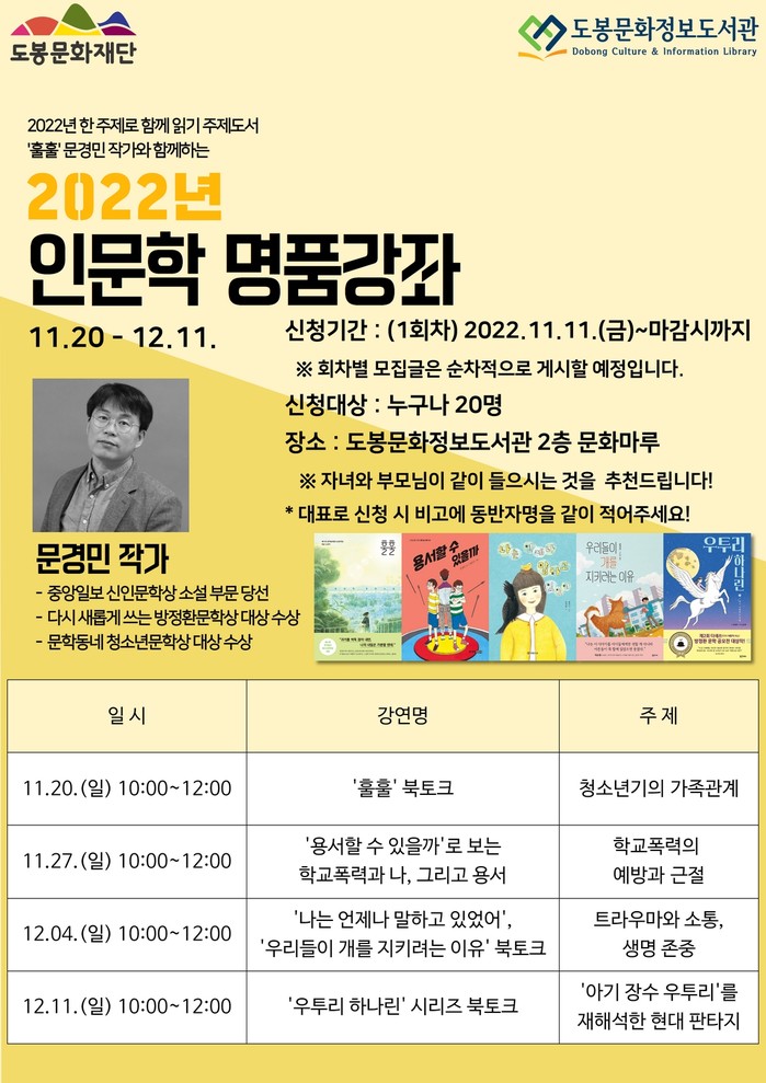 강연회 신청 및 자세한 사항은 구 통합도서관 홈페이지 혹은 도봉문화정보도서관에서 확인할 수 있다.