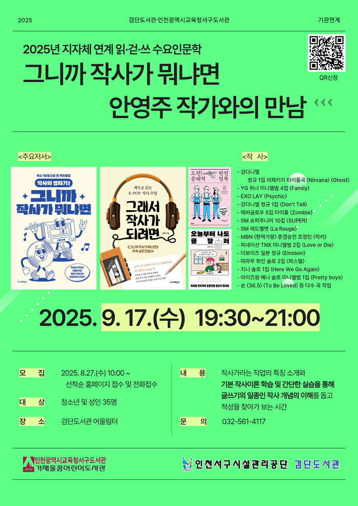 [인천=문찬식 기자] 인천광역시교육청서구도서관(관장 정연순)은 ‘지자체 연계 읽걷쓰 수요인문학’의 일환으로 검단도서관에서 9월 17일(수) 오후 7시 30분부터 9시까지 안영주 작사가 초청 강연 ‘그니까 작사가 뭐냐면’을 운영한다.