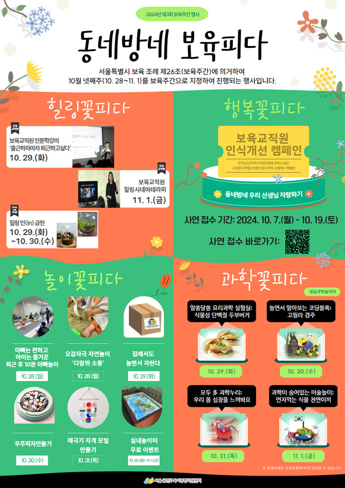 이번 보육주간 행사는 금천구 육아종합지원센터 주관으로, 금천구의 양육 친화적 환경을 조성하고자 ‘힐링꽃피다’, ‘행복꽃피다’, ‘놀이꽃피다’, ‘과학꽃피다’ 총 4가지 주제(테마)로 진행된다.