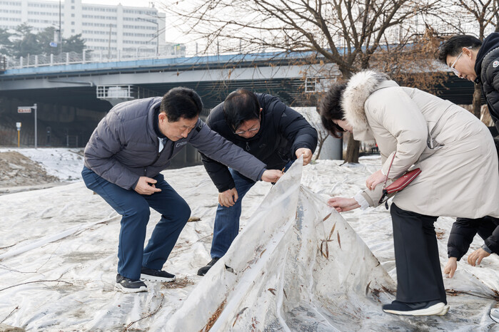 박강수 서울 마포구청장이 최근 월드컵천 청보리 식재 현장을 찾아 진행 상황을 점검했다. 마포구는 지난해 중동교에서 성산천 합류부까지 연장 1.56km의 월드컵천 구간을 정비했으며, 현재는 오는 봄 주민에게 자연의 푸름을 선사하고자 월드컵천을 따라 청보리를 식재하고 있다. 사진은 박 구청장(왼쪽 두 번째)이 청보리 식재 현장을 점검하고 있는 모습. (사진=마포구청 제공)