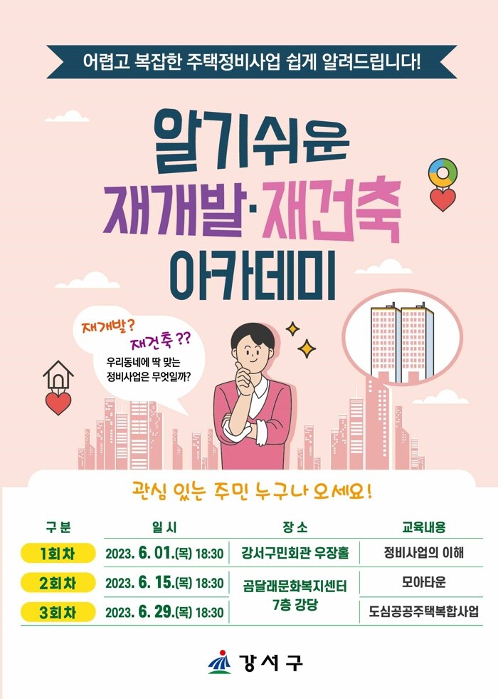 [시민일보 = 홍덕표 기자] 강서구는 재개발, 재건축에 대한 궁금증을 해결해 주기 위해 '알기 쉬운 재개발·재건축 아카데미'를 개최한다고 30일 밝혔다.