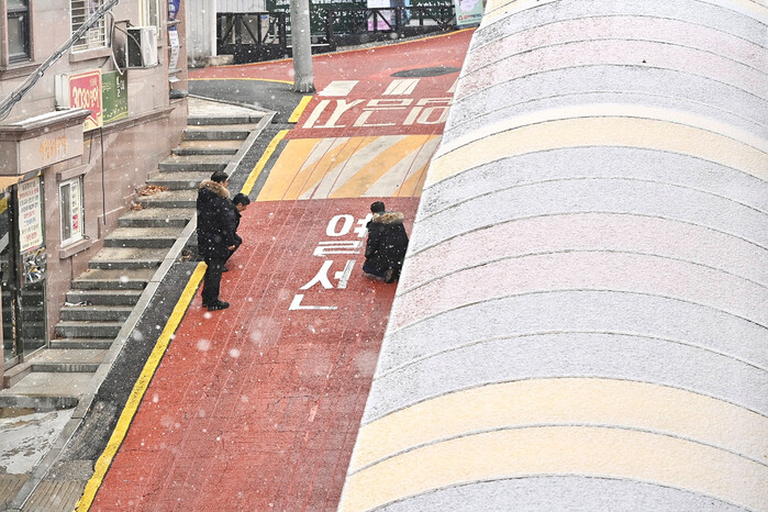 | ▲ 정목초 인근 비탈길 도로열선 현장에서 점검 중인 구 관계자 모습 (사진=양천구청 제공) |