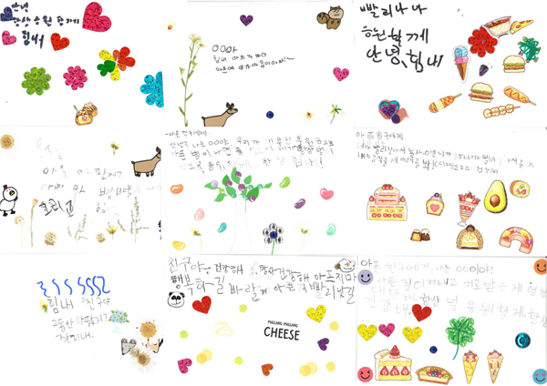 | ▲ 마포구 6호점 우리동네키움센터 아이들이 직접 작성한 난치병 아동 위한 응원 카드 |